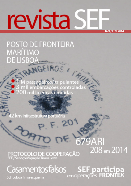 SEF participa em operações FRONTEX Casamentos falsos Protocolo de Cooperação Posto de fronteira marítimo de lisboa 679ARI 208 em 2014 42 km infraestrutura portuária SEF / Serviço Migração Timor Leste SEF coloca fim a esquema 1 M passageiros/ tripulantes 3 mil embarcações controladas 200 mil licenças emitidas revista SEF JAN / FEV 2014