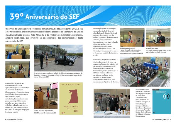 39º Aniversário do SEF O Serviço de Estrangeiros e Fronteiras comemorou, no dia 23 de junho 2015, o seu 39.º Aniversário, em cerimónia que contou com a presença do Secretário de Estado da Administração Interna, João Almeida, e da Ministra da Administração Interna, Anabela Rodrigues, que presidiu ao encerramento das comemorações deste aniversário do SEF. O Relatório de Imigração, Fronteiras e Asilo 2014, apresentado pela Coordenadora do Gabinete de Estudos Planeamento e Formação, Maria José Ribeiro, é um instrumento que contribui para a caracterização das dinâmicas e processos migratórios e que espelha, em larga medida, o trabalho realizado pelo SEF, no último ano, em torno dos seus três eixos de atuação: imigração, fronteiras e asilo. O RIFA 2014 está disponível no SEFSTAT, portal de Estatística do SEF. A cerimónia, que teve lugar na Sede do SEF, integrou a apresentação do Relatório Imigração Fronteiras e Asilo 2014 e assinalou a entrega de 20 novas viaturas ao SEF. 2 SEF em Revista - julho 2015