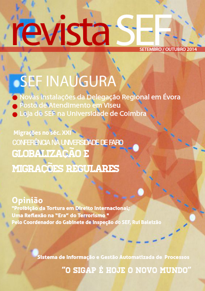 Opinião "Proibição da Tortura em Direito Internacional; Uma Reflexão na “Era” do Terrorismo " Pelo Coordenador do Gabinete de Inspeção do SEF, Rui Baleizão Conferência na universidade de FARO Globalização e migrações REGULARES regulares SEF inaugura Novas instalações da Delegação Regional em Évora Posto de Atendimento em Viseu Loja do SEF na Universidade de Coimbra revista SEF SETEMBRO / OUTUBRO 2014 Sistema de Informação e Gestão Automatizada de Processos "O SIGAP é hoje o Novo Mundo" Migrações no séc. XXI