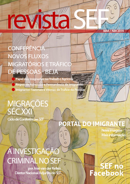 SEF no Facebook A investigação criminal no sef Conferência novos fluxos migratórios e tráfico de pessoas - Beja migrações séc.xxi tráfico pessoas Ciclo de Conferências SEF por José van der Kellen Diretor Nacional Adjunto do SEF Papel dos Imigrantes no Trabalho Agrícola Regras de Admissão e Permanência de Imigrantes Imigrantes Sazonais e Vítimas de Tráfico de Pessoas revista SEF MAR / ABR 2014 Nova imagem Mais informação PORTAL DO IMIGRANTE